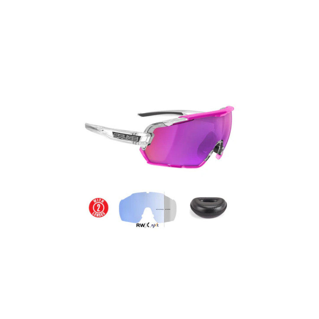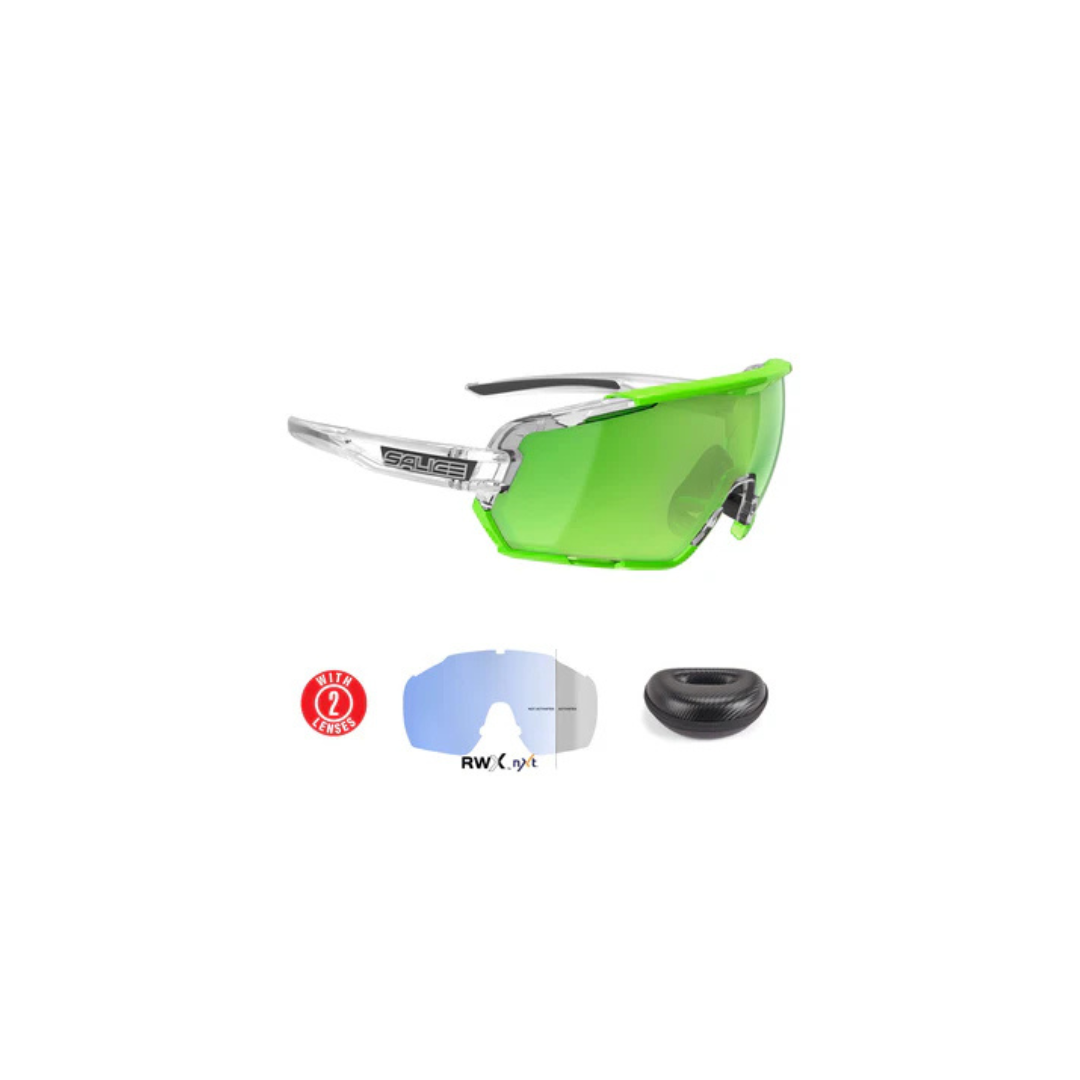 Includes a Photochromatic Mirror Light Adaptive Lens and a High Contrast Mirror Lens, a rim and a spare nose piece, with a clean cloth in a thermoformed protective case